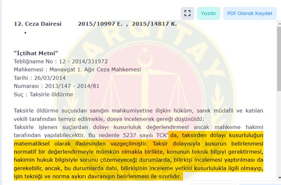 Yargıtay 12. Ceza Dairesi 2015/10997 E., 2015/14817 K. Sayılı İlamı “Taksirle işlenen suçlardan dolayı kusurluluk değerlendirmeesi ancak mahkeme hakimi tarafından yapılacaktır.” İlgili karar metni aşağıda yer almaktadır.